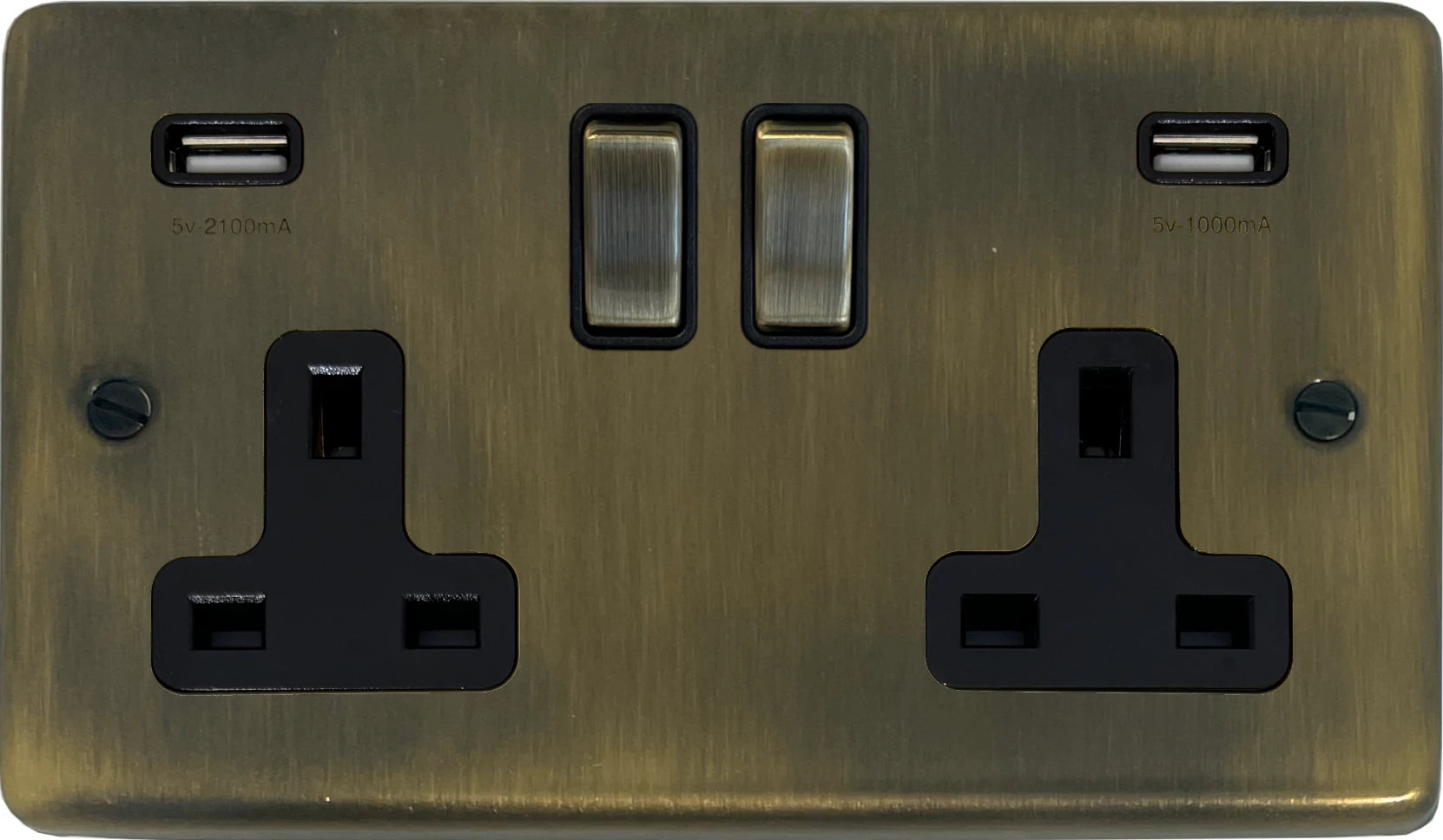 Contour Antique Brass 2 Gang Socket with USB (Brass Switches)