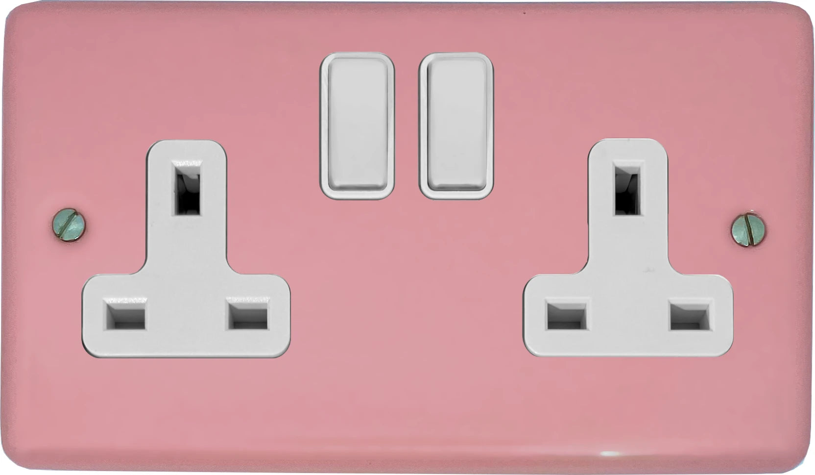 This is a pink socket from G+H Electrical Accessories. It is made of steel with a gloss pint powder coated finish. It comes with white rocker switches and inserts. It is a double pole (DP) switched socket.