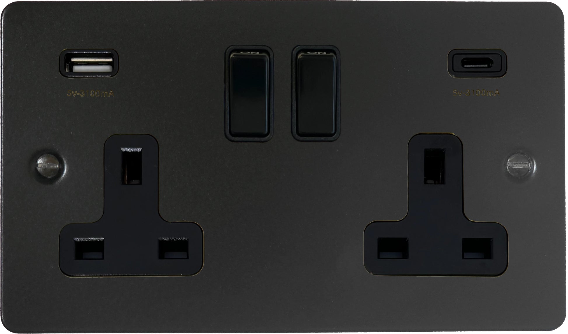 Flat Black 2 Gang Socket with USB (Black Switches) (A+C)