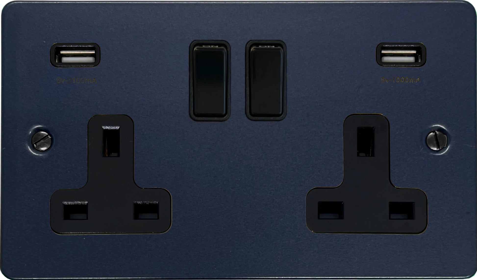 Flat Blue 2 Gang Socket with USB (Black Switches)