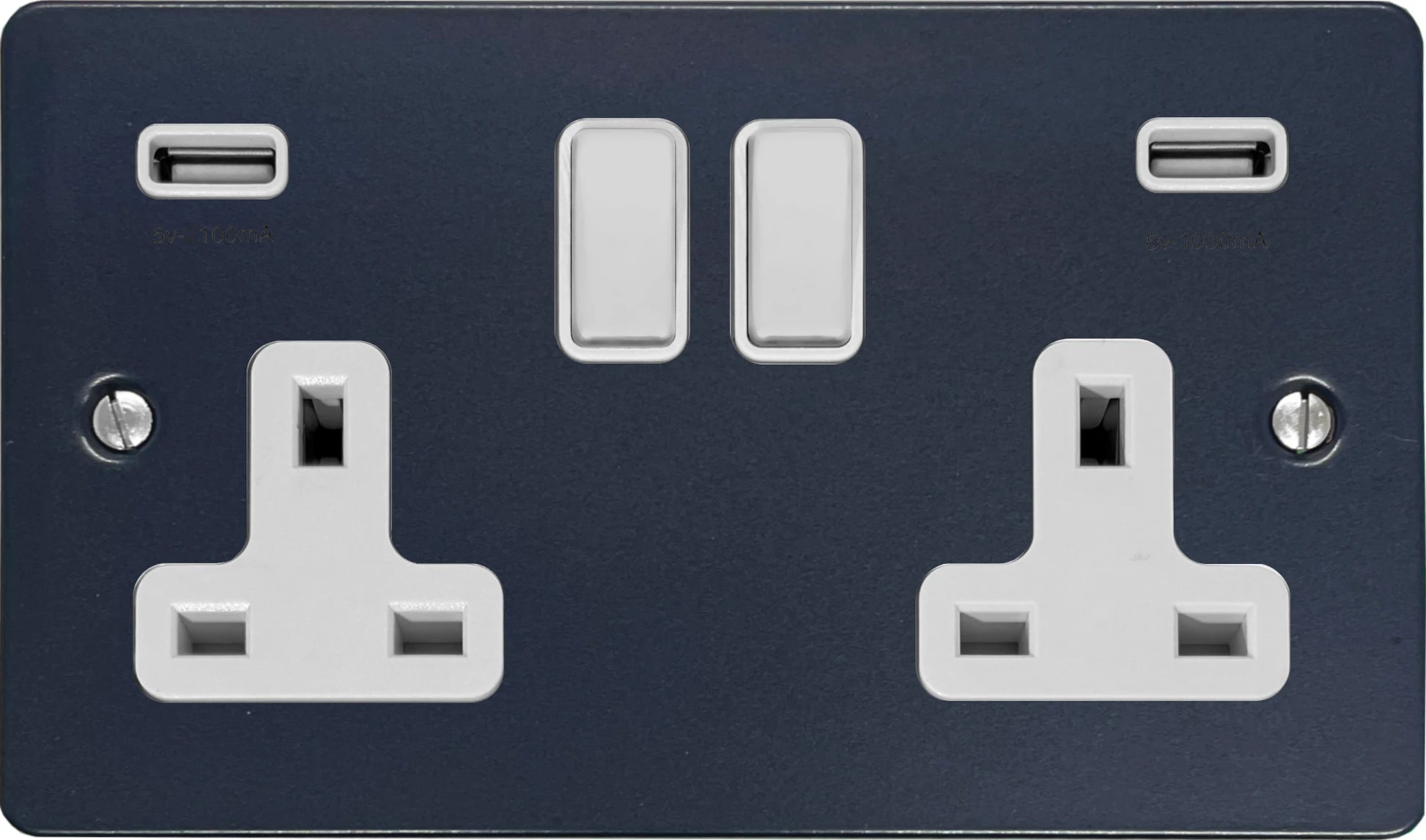 Flat Blue 2 Gang Socket with USB (White Switches)